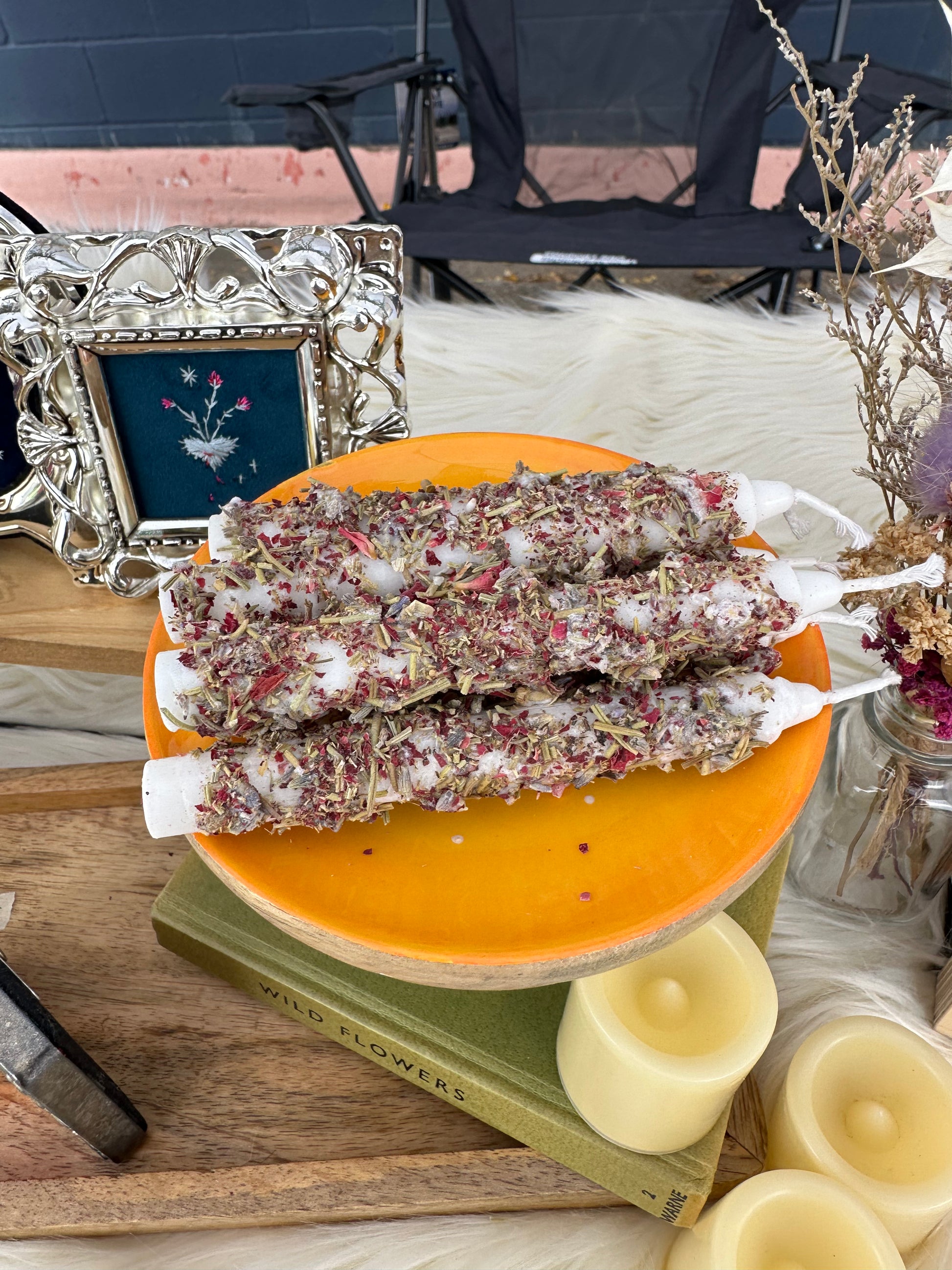 These chime candles were dressed in chamomile, rosemary, rose and lavender.